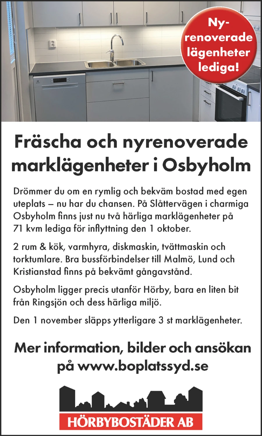 Den 1 november släpps ytterligare 3 st marklägenheter. Mer information, bilder och ansökan på www.boplatssyd.se
